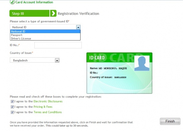 ৮। এখন সব ঠিক ভাবে পূরণ করে Finish এ ক্লিক করুন। আপনার Payoneer এর Registration সম্পন্ন হল। এখন ২-৩ দিন সময় নিবে কার্ড Approve হওয়ার জন্য। কার্ড Approve হলে আপনাকে Shipping Date মেইল এর মাধ্যমে জানিয়ে দেওয়া হবে। সাধারনত কার্ড আসতে ২০ থেকে ৩০ দিন লাগে। DHL এর মাধ্যমে ৬০ ডলার খরচ করে ৩ দিনে আপনার কার্ড পেতে পারেন।