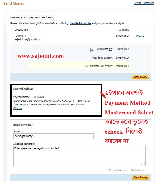 যখন আপনার পেপাল এ ডলার না থাকে তখন আপনি ইচ্ছা করলে আপনি আপনার পেপাল এ লিঙ্ক করা মাস্টারকার্ড এর ডলার ব্যবহার করতে পারেন। অন্য কারো পেপাল একাউন্টে পাঠাতে পারেন, পেমেন্ট দিতে পারেন। এ জন্য আপনি ডলার সেন্ড করার সময় অবশ্যই পেমেন্ট মেথড সিলেক্ট করে নিবেন, কোন অবস্থায় ব্যাংক অথবা echeck সিলেক্ট করবেন না।